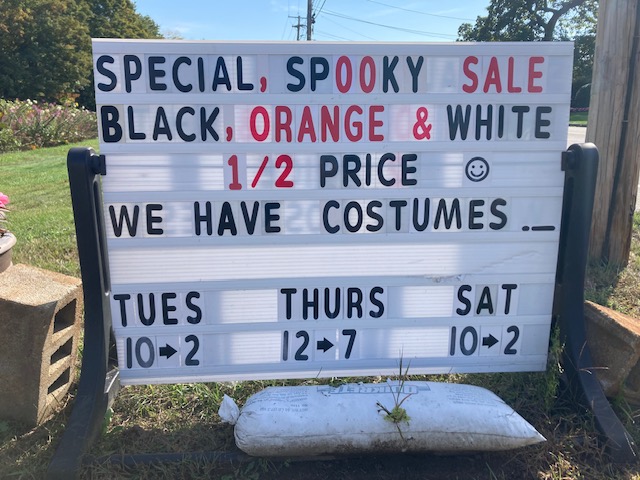 Our October Special spooky sale includes any clothing with the colors black orange or white. These items will be half price.